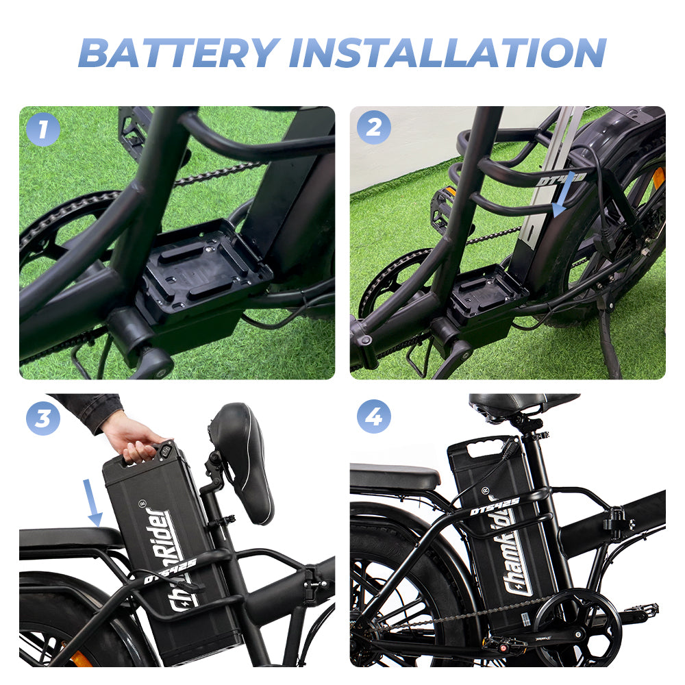 - Check out the image—installing the ChamRider Super Fish Battery is a breeze! Specifically designed for DT450/DTS425 e - bikes, just follow the steps: place it, lock it, and go! No extra mods—seamless compatibility for your electric bike for food delivery. Even a newbie can do it!