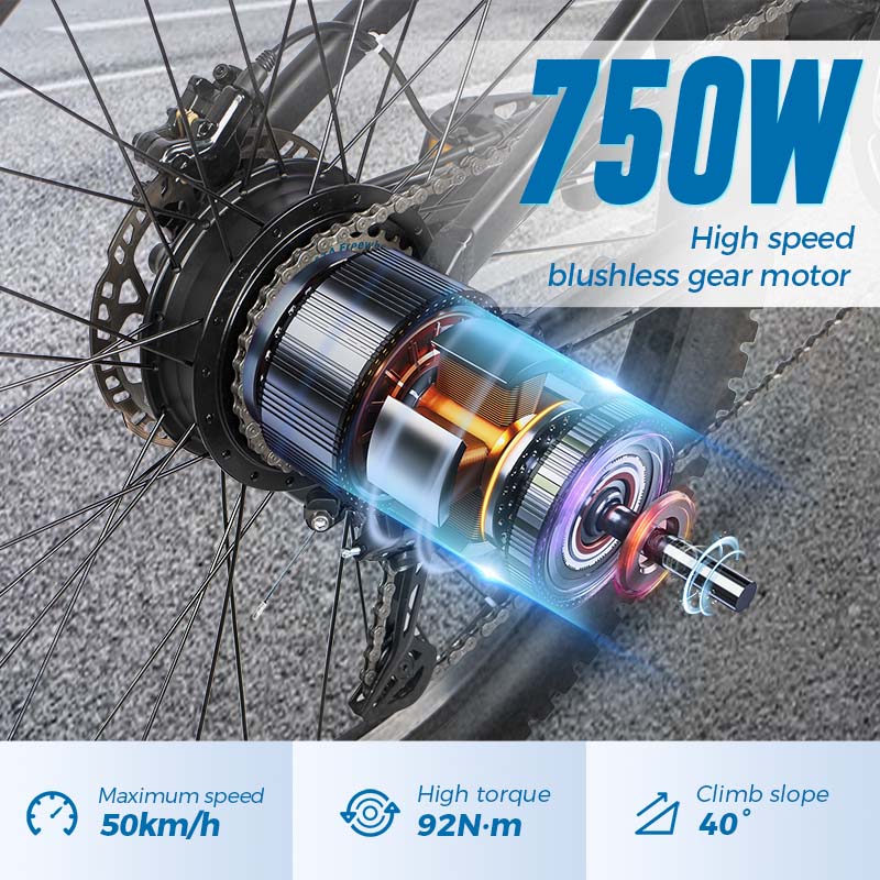- 750W High-Speed Motor: Delivers relentless power for steep climbs and rapid acceleration. Outpace traditional e-bikes on both tarmac and dirt.