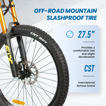 - Scene: Tackle Europe’s roughest trails—Alpine ridges, Pyrenean rock gardens, or Scandinavian forests—with 27.5" CST slashproof tires designed to resist punctures and grip loose gravel, mud, and roots. The aggressive tread pattern ensures stability on steep climbs and descents, perfect for adrenaline-chasing riders.