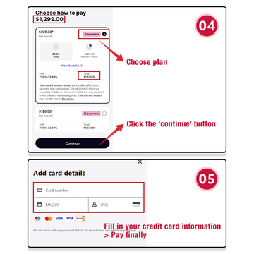 The easiest payment option when you want to make a larger purchase more manageable over time. Klarna offers financing plans that range from 6-24 months.