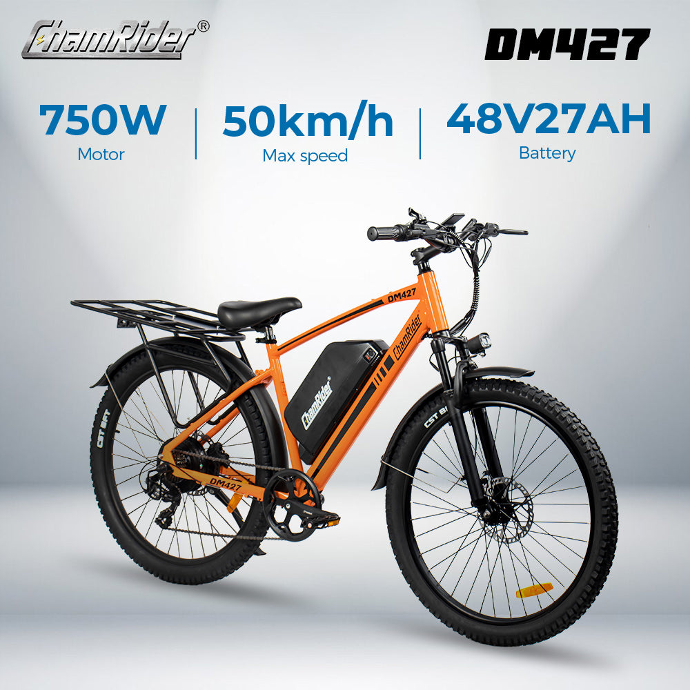 - Power-Packed Performance for Diverse UsesEuropean teens, riders, and delivery pros, ChamRider DM427 E-MTB delivers! With a 48V750W high speed brushless gear motor (Max speed 50KM/H) and 92N·m Torque, it’s ideal for electric commuter bike daily travels or electric delivery bike tasks. The 40° Gradability conquers steep European roads, proving this multi-functional e-mountain bike excels in commuting, delivery, and adventurous rides.