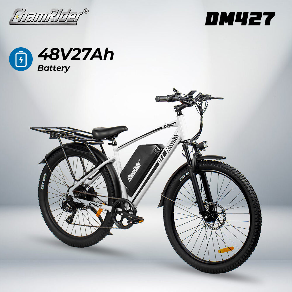 - Reliable Durability for Work & PlayTeens and riders, ChamRider DM427 E-bike delivers on all fronts. The REMOVABLE 48V27AH BATTERY offers 113km (Gear 4) for electric commuter bike routes or parcel delivery e-bike jobs. Its 4A fast charger and Cycle times ≥1000 ensure consistent performance, while the lightweight stylish E-MTB design appeals to those seeking a multi-functional e-mountain bike that balances work, delivery tasks, and casual rides across European landscapes.