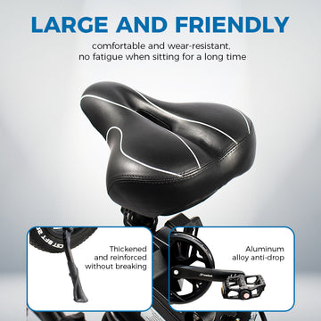 ChamRider DT450 Ebike’s LARGE AND FRIENDLY saddle (highlighted in black), paired with a stable Thickened Reinforced Kickstand and Aluminum Alloy Anti-Drop Pedals. The bike’s 48V 50AH battery is visible on the frame.]